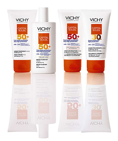Proizvodi iz najnovije Vichijeve linije za zaštitu kože od sunčevih zračenja Capital Soleil jedni su od najboljih koji se mogu naći na našem tržištu. Kreme i raspršivači Capital Soleil imaju u sebi ugrađen Mexoryl filter koji pruža dvostruku zaštitu od UVA i UVB zraka. Osim toga, ova sredstva za sunčanje, baš kao i svi ostali Vichyjevi proizvodi, sadrže i termalnu vodu koja smiruje kožu i djeluje protuiritacijski. Proizvodi za zaštitu od sunca ne sadrže konzervanse, vodootporni su i ne uzrokuju stvaranje mitesera. Najveći zaštitni faktor Capital Soleil mlijeka je 60, raspršivača 30. Ukoliko želite da vam brončana boja traje duže, po povratku s plaže nanesite Vichijev losion poslije sunčanja.