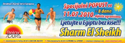Relax Tours i ove godine ispunjava Vaše želje i vodi Vas direktnim letovima iz Sarajeva u najluksuznija ljetovališta Crvenog Mora, Sharm el Sheikh i Hurghadu, sve do kraja ljeta...