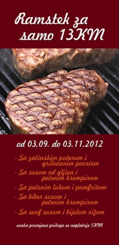 U Restoran baru Peppers super ponuda, ramstek sa prilogom po cijeni od nevjerovatnih 13.00 KM. Posjetite Restoran bar Peppers i obradujte sebe na najbolji način.