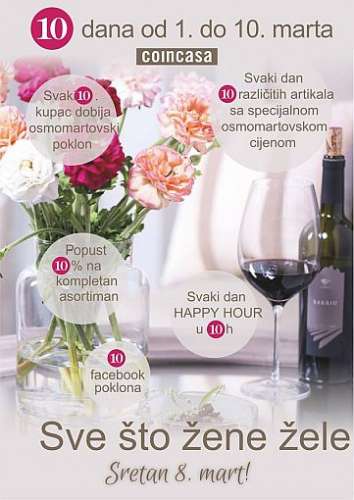 Svaki 10. kupac dobija osmomartovski poklon, popust od -10% na kompletan asortiman, svaki dan HAPPY HOUR u 10 h i 10 super poklona za svoje facebook fanove. Čista 10-ka. Posjetite Coincasa prodajni objekat u BBI Centru na IV spratu.